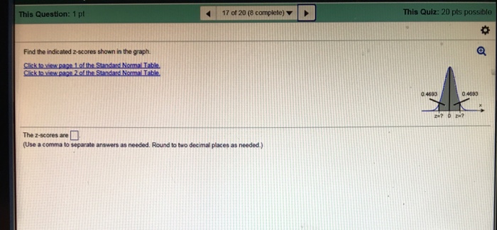 Click to view page 1 of the table. 0 x 04678 04678 A normal curve is over a horizontal x-axis and is centered on 0. Find the indicated z-scores shown in the graph.